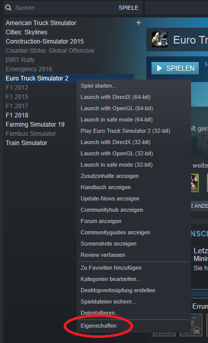 2) Klicke mit der rechten Maustaste auf der linken Seite in Steam auf "Euro Truck Simulator 2" (American Truck Simulator) und öffne die "Eigenschaften".